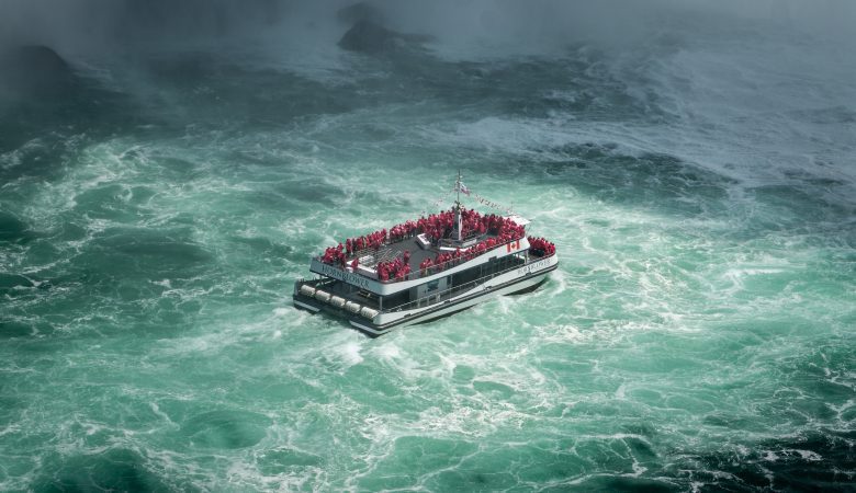Boat under the Iguazú Falls